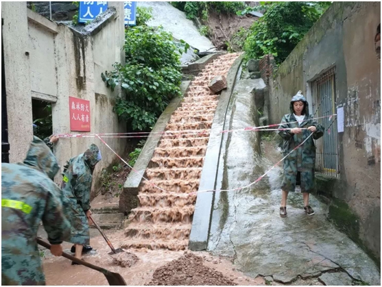 云溪镇弥江社区纪检员同社区干部一起在受灾路段拉警戒线、清理洪水淤泥