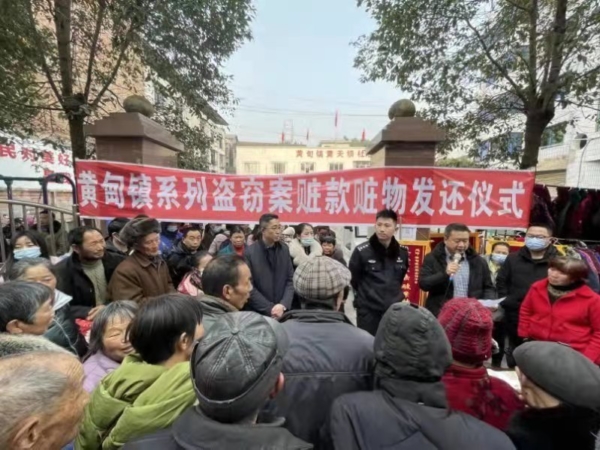 2021年2月2日,盐亭县公安局黄甸派出所举行赃款发还仪式,群众敲锣打鼓送来锦旗表示感谢。