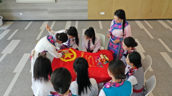 北川绣娘与百名大学生共绣团旗,让青年学生重温了团的历史,坚守入团初心,坚定不移跟党走,同时认识到了要学好技能,练就过硬本领,在青春的赛道上当好领跑者。