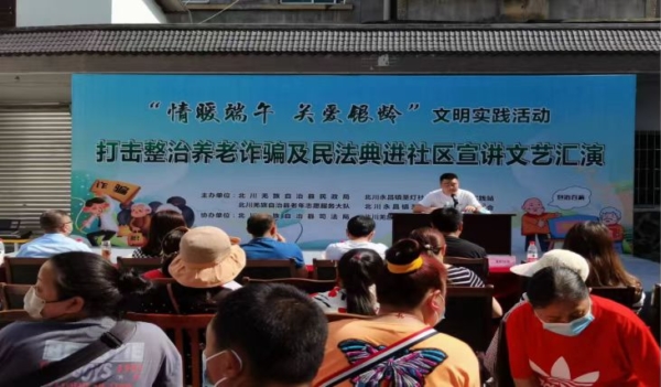 县民政局以“情暖端午,关爱银龄”活动为依托,开展打击整治养老诈骗及2022年民法典进社区宣传活动,将打击整治养老诈骗及民法典宣讲与端午文艺汇演相结合,将防诈骗知识融入到快板《齐心协力防诈骗》和小品《涨钱》等节目中,深入浅出地向现场老人宣传简单、实用、易懂的防诈骗知识,以事实案例告诉老人如何防范电话、短信、网络诈骗等。活动现场发放宣传册500余份,受教群众覆盖永昌镇近3000余人,营造了浓厚的反诈骗和端午节日氛围,帮助老年人筑牢了安全防线。