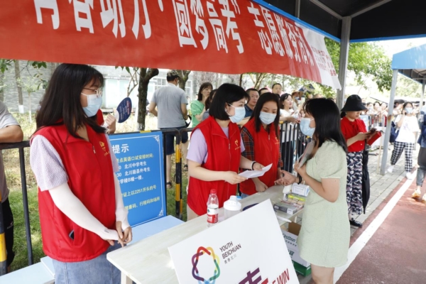 上午8点,距离开考还有一小时。志愿服务队在北川中学门口早早搭建起志愿者高考服务岗,为考生们准备好了口罩、矿泉水,以及2B铅笔、圆珠笔、橡皮等文具。并向考生、家长解答考试相关事宜,得到了场外陪考家长们的一致好评,“志愿红”成为考场外一道靓丽的风景线。