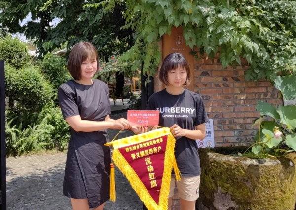 青义镇柒里咖啡负责人接受“星级商户”流动红旗