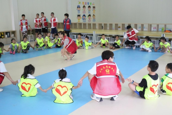 开营仪式结束后,身着红色马甲的心沐志愿者们组织参加夏令营的小朋友们进行了破冰小游戏,通过桃花朵朵开、小手拉大手、转圈等游戏,在增加彼此间了解的同时,充分调动了大家的活动积极性。