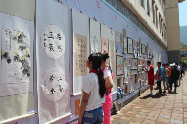 “正气浩然”“上善若水”“品若梅花香在骨,人如秋水玉为神”……在擂鼓镇小学校园广场上,一场以“涵养师德师风”为主题的书画展吸引了广大师生驻足观看。