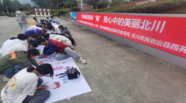 西苑学子还进行了“我心中美丽的北川”长卷画绘制。学生们用手中的画笔,把自己内心的文明城市、和谐社区、美好家园的美好形象展现出来。绘画中气氛热烈,小组协调共同完成创作,真情展露美丽北川、美丽家园新形象。