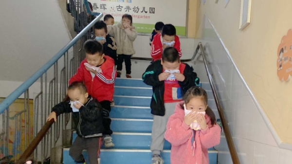 开展消防应急疏散演练。演练中,“火灾警报”响起,教师立即告知幼儿“发生火灾了,不要慌”,并指挥幼儿迅速匍匐身体,稍微低头,拿小毛巾捂住口鼻,一个接一个排队,按照预定的疏散路线,安全有序撤离到学校操场。幼儿园负责人作活动总结,集中进行消防安全教育,并通过提问、故事讲述等方式,帮助幼儿了解火灾成因,牢记119报警电话,重点讲解了面对突发状况的自救方法,提升了全体师幼的自救自护能力。(供稿:三台县古井小学幼儿园 范杨梅)