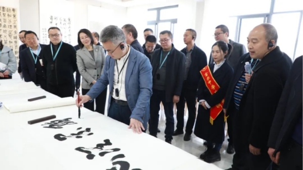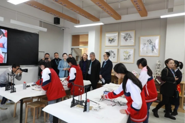 在“丹青阁”——吴斌书画传习工作室,富乐学子行云流水的画笔,在水墨流动间,向传统的中国画里有机融入了书法艺术的视觉元素,为与会领导和专家展示了富乐学子的风采。(供稿:绵阳富乐实验中学 杨清明)