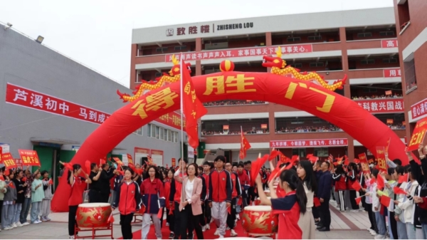 当天的校园,红旗招展、鼓声震天,红色的成功之路,宽阔平坦,金色的成功之门,正对着学子们殷勤召唤。上午九时许,该校党总支部书记严敏擂响战鼓,教学楼上下,欢声雷动,红旗飘扬,誓师大会正式开始。