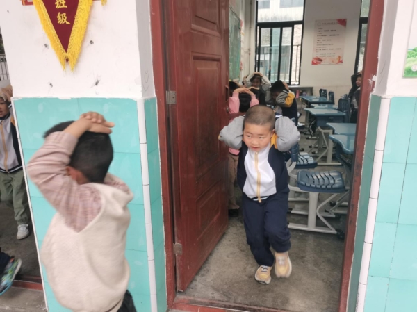 当天上午8时55分,随着一声警报响起,老师组织学生迅速双手抱头找室内有柱头的地方蹲下,或趴在桌子旁边。约15秒后,第二声警报响起,各班学生在班主任和科任老师的引导下开始有序撤离。仅用了2分30秒,全体师生迅速撤离到操场指定集合地点。