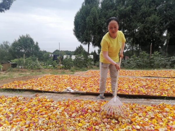 刘小英正在晾晒七彩菊 刘玉明 摄