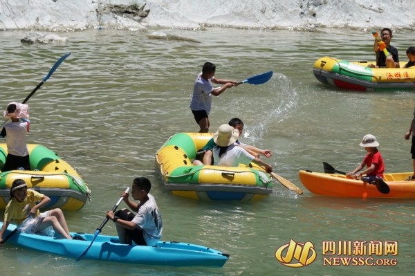 记者在现场看到,洒啦溪景区的鹊桥、网红河堤、羌王长廊等特色体验项目前聚集了许多游客,大家在凉爽的溪水中踏水、打水枪、伐竹筏,在美食摊位前品尝当地美食、在激流勇进中感受漂流的刺激,尽情享受水中乐趣,整个山谷充满欢乐的气息。