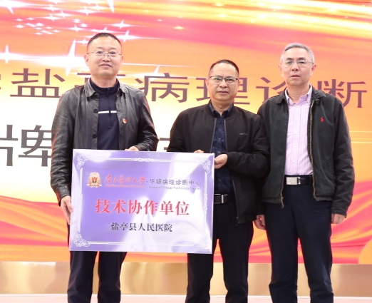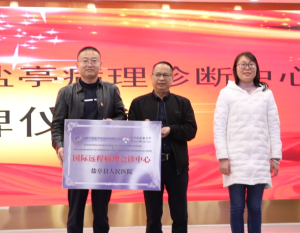 四川省人民医院理科主任、硕士生导师徐刚教授为该院颁授了盐亭县人民医院“南方医科大学 华银病理诊断中心”《技术协作单位》牌匾,成都华银病理诊断中心主任刘莉教授为该院颁授了盐亭县人民医院“宾夕法尼亚大学”《国际远程病理会诊中心》牌匾。