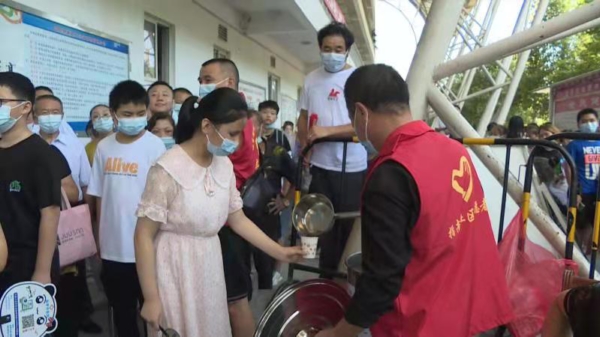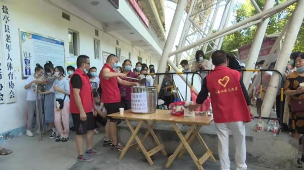 “各位市民,口渴的、需要喝水的就到前面来,香炉草水,喝了清热解毒,又能解渴……”这是盐亭县凤灵街道指南社区的志愿者将他们用香炉草熬制的凉茶送到县体育馆新冠疫苗接种点,让起早贪黑的医护工作者和接种群众能饮上凉凉的降暑凉茶。