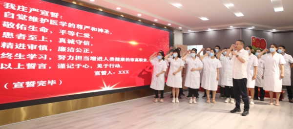 王栋带领全体医师重温了《中国医师宣言》,表达了自觉维护医学的尊严和神圣的信心与决心。
