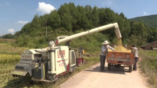 巨龙镇梓水村收割机手何均收完了自家水稻后,这几天在周围帮助村民抢收水稻挣现钱。“以前打工现在回家种地,买了个收割机,种了有50余亩土地,收完了就出来帮别人收点,一季能挣四、五万,一年挣个十来万,收益还是挺可以。”收割机手何均告诉记者。