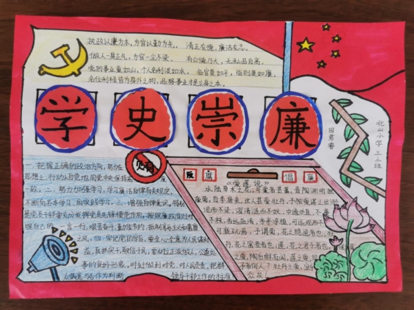 北山小学结合党史学习教育经验,积极引导学生在优秀历史作品中汲取“廉洁文化”养分,做到“学史崇廉”,并将廉洁贯彻到校风学风和学生日常生活当中。七一涪江小学三年级的同学带来了《墨梅》《石灰呤》硬笔和软笔书法,通过书写古诗词展现廉洁文化和清风傲骨。