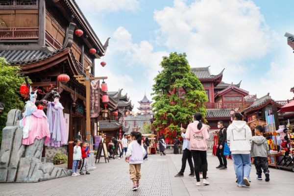 4月30日,在绵阳方特,已能深入感受到五一的欢乐氛围。进入园区后,从清韵小镇到节庆广场,沿路的国风表演让人目不暇接,引来不少游客拍照留念或参与互动。除了精彩的表演之外,在街道两侧还能看到精心布置的国风集市,行走其中仿佛穿越回千年前繁华盛景,熙熙攘攘、古韵浓厚。
