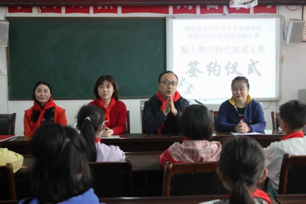 四川新闻网消息 5月18日,绵阳市安州区青少年活动中心援助安州区河清镇迎新小学粘土创作特色建设工作签约仪式举行。区委教育工委专职副书记李光涛,青少年活动中心主任陈瑶、副主任钟敏一行及迎新小学相关负责人员参加了签约仪式。