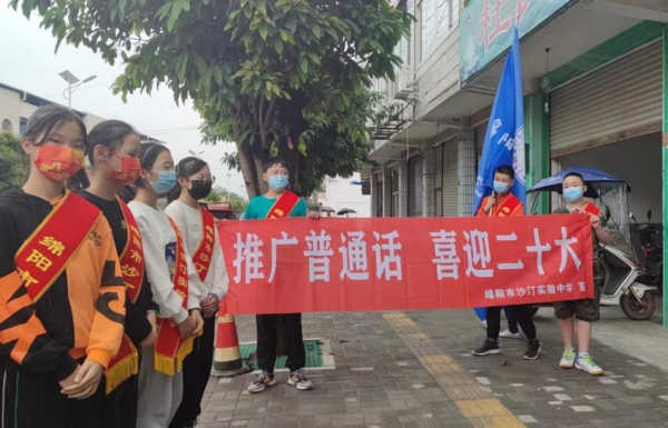 绵阳市沙汀实验中学在校园醒目处设立永久性评议文字规范标语牌,电子屏幕滚动播出宣传标语。升旗仪式上,通过“国旗下演讲”对全校师生进行了动员,倡导全校师生人人参与,坚持说好普通话,写好规范字,营造良好的校园语言文化氛围。各班语文老师进行“推普周”宣传教育,向学生发出“推普周”活动倡议,在班级内积极营造宣传氛围。该校部分班级在语文老师的带领下走上街头,向商家和路过的市民发放推普宣传资料,讲解推普法律法规等活动,受到广大市民一致好评。