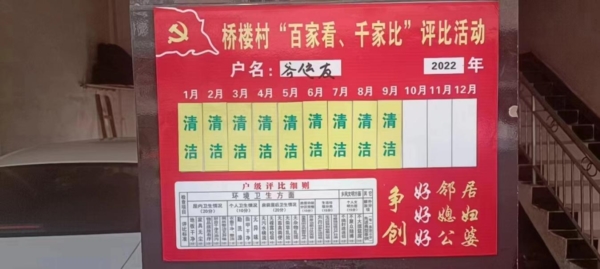 9月19日一大早,桥楼村3组村民袁彦秀打开家里的大门,拿着扫帚到门前的道路上开始清扫。右侧墙面上,醒目的贴着一张“清洁评比牌”,上面写着“清洁”二字。几分钟后,他将公共道路清扫完毕的垃圾放进附近路边的垃圾桶。在此期间,周围的几位住户也相继拿着扫帚出门清扫公共道路,将路边的小广告揭掉。这些住户的家门口分别贴着“最清洁”、“清洁”等字样的“清洁评比牌”。