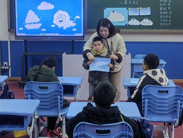 课堂上,新教师们运用多种教学手段调动学生的积极性,将“寓教于乐”的教学理念渗透到课堂中,充分把握和挖掘课堂中的有效资源,创设适合的教学情境,以丰富而充实的教学内容,新颖而有创意的教学策略和方法,向全校老师进行了展示。龙沁洋老师带来了《蓝天白云》一课,通过视频感知、图片感知、活动感知等方式让学生深入理解词语;陈治衡老师带来了《认识收银条》一课,通过海绵宝宝和派大星去天天面包房买面包进一步展开了教学……四位授课教师展示了精彩生动的课堂,给大家留下了深刻的印象。