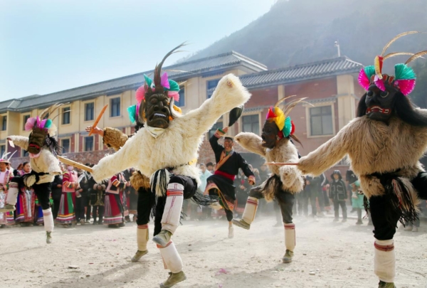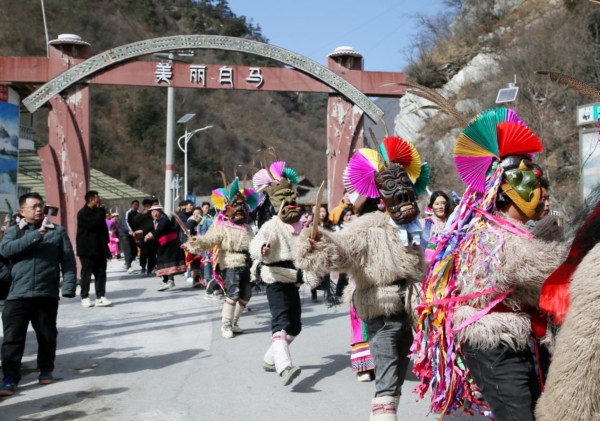 从大年初五晚上开始,村民们就聚集在村子的广场上,围着熊熊燃烧的篝火跳起圆圆舞,欢快的歌声响彻村寨。已被列入国家级非物质文化遗产名录的跳曹盖,是白马人过年的“重头戏”,他们身着传统服饰,头戴曹盖面具,随着有节奏的鼓声起舞,以夸张的舞姿表现对自然的崇拜,驱邪纳吉,祈福来年人畜平安、五谷丰登。