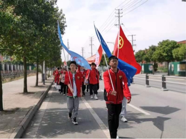 “请旗手开路”,随着出发号令的发出,在三名旗手的引领下,全体学生在班主任和跟班老师的带领下按班级序号,分两路纵队,排着整齐的队伍,迈着整齐的步伐浩浩荡荡地从学校出发,个个精神抖擞,意气风发。