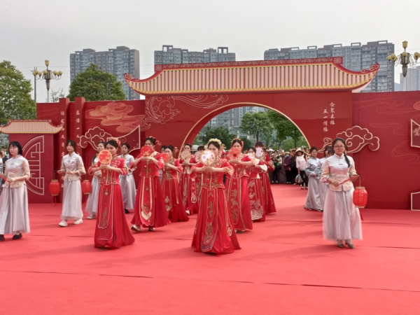 在热烈的氛围中,新郎登喜堂、新娘入华堂、新郎迎新娘、新人升喜堂、交换信物、同写婚书、结发礼、饮合卺酒……一对“钻石婚”和一对“金婚”模范夫妻分别登台,为新人分享幸福长久的爱情婚姻经验,同时送上最美好的祝福。
