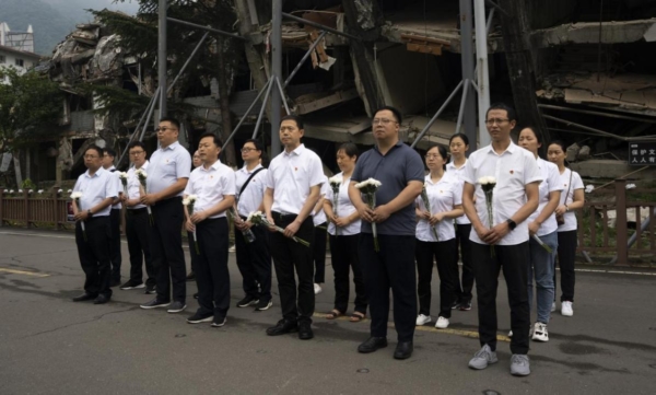 在纪念馆,管理处全体党员仔细聆听讲解人员的解说,认真观看地震后留下的实物、图片和复原场景,感慨万千,在北川遇难者掩埋遗址前,全体党员鞠躬献花表达哀思。