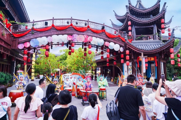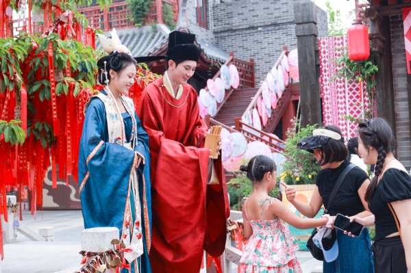 活动期间,绵阳方特推出了399元的双人优惠套票,吸引了大批游客前来游玩体验。在这座以国风为主题的乐园里,洋溢着充满传统民俗风情的节日氛围,月老送签、绣球争喜,让游客开启沉浸式七夕游园体验。据了解,本次活动绵阳方特延长营业时间至晚上9点,让游客充分体验主题项目的同时,也能更深切地感受七夕的美好与浪漫。