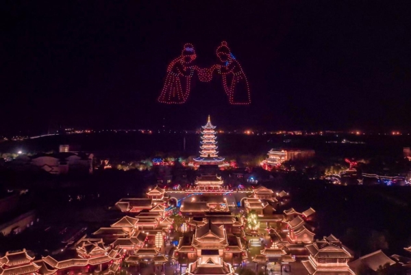 除了庄重的“汉婚大典”,绵阳方特还上演了精彩的歌舞表演。在夜晚的最后时分,园区上空还展开了一场震撼的天幕大秀。美轮美奂的烟花表演和浪漫璀璨的无人机光影秀,为游客献上了一封星空情书,留下美好的七夕回忆。