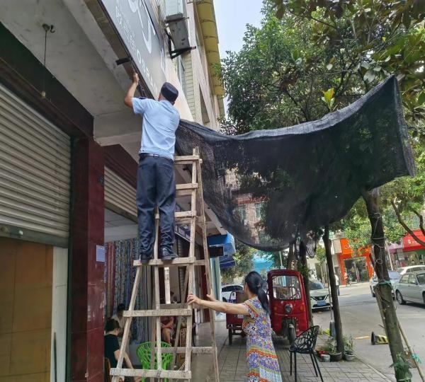 前期,执法人员多次与商户进行上门沟通,向商户宣传《绵阳市市容和环境卫生管理条例》等法律法规及文明城市创建相关工作要求,告知违规设置遮阳棚的危害性及危险性,希望店主能够理解并支持城管工作,自行拆除违规遮阳棚。对自行拆除有困难的商户,执法人员在保障安全的前提下,逐一进行清除。同时,督促商户自觉遵守落实“门前五包”,维护整洁有序的市容环境,目前已拆除违建遮阳棚10余处。