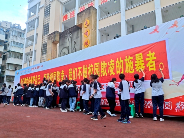 班会活动结束后,学校组织了一场千人签字活动。同学们纷纷在印有“我们要学会保护自己,拒绝校园欺凌,我们不做校园欺凌的施暴者”的横幅上签下自己的名字,以此表达对校园欺凌零容忍的态度。