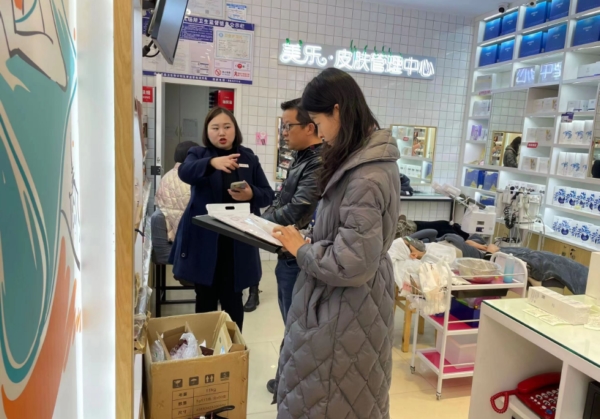 检查中,工作人员严格按照相关行业规范要求,从主体环境、产品合法性、标签标识、渠道来源、放心消费等多个方面对化妆品经营企业进行全方位检查,通过边查边改,切实做到检查一家、规范一家。同时,打好“组合拳”,对所有化妆品经营企业实施“一对一”上门指导,现场答疑解惑,手把手指导台账制作、索证索票、产品合法性查询等实务操作,确保化妆品进货渠道合法、产品质量可靠、储存经营合法合规。