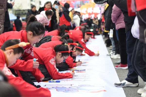 33米的巨幅画作一出场,便赢得了阵阵掌声,来自界牌小学的33名学生带来的长轴绘画是节目的“开胃菜”,随后各个村社区自导自演自编的文艺节目轮番登场,一曲《元宵喜乐》瞬间点燃现场气氛,精彩的《沙场之花》彰显了华夏儿女世代的英姿飒爽,人群中喝彩声不断,每个人的脸上都洋溢着灿烂的笑容。节目《烟雨行舟》的舞蹈表演,在悦耳的曲调中,演员们踏着欢快的节奏左右穿插,多样的舞姿看得现场观众如痴如醉。