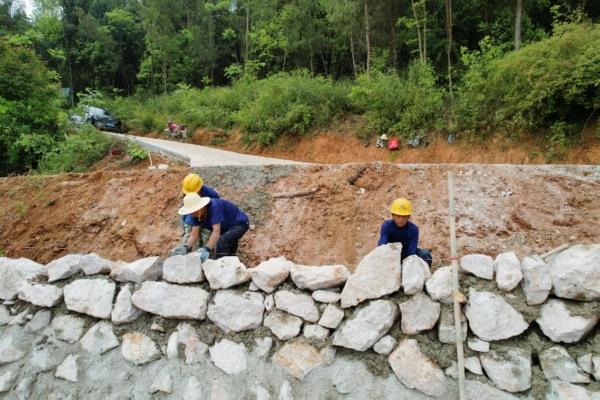 在田地一角,挖掘机正进行堡坎加固收尾工作,工人们忙着搅拌水泥、加固石材。以前,这里原有的山坪塘存在漏水问题,遇到旱季极易干涸,堡坎的加固不仅解决了山坪塘蓄水问题,也在灌溉供水、防洪排涝中也发挥着巨大的作用。