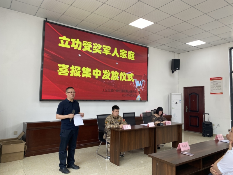 工区街道退役军人服务站工作人员杨婷宣读了立功受奖现役军人名单,参会领导为24名立功受奖现役军人家属发放了喜报及慰问金,表彰他们的杰出表现和突出成绩。(供稿:涪城区工区街道 马巧红)