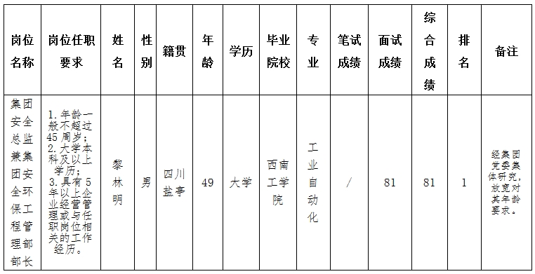 绵阳燃气集团有限公司关于招聘集团安全总监兼集团安全环保工程管理部部长岗位测试成绩的公示