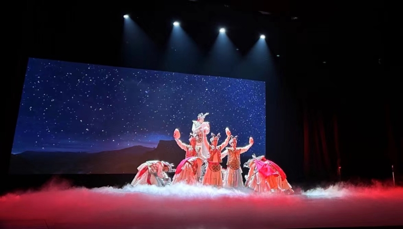 随后,情景乐舞《天地之缘》讲述了天神“木比塔”美丽的小女儿“木姐珠”与吹着羌笛的牧羊人“斗安珠”的爱情故事。演员们以精湛的技艺和饱满的热情,通过精彩绝伦的歌舞表演,生动地演绎出羌族人民的日常生活场景,爱情故事如诗如画,民族精神坚定而深沉。