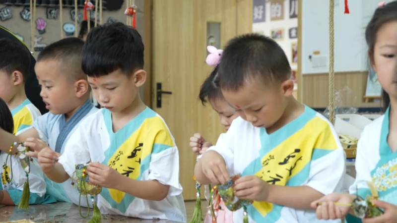 不仅如此,除了“双重龙舟赛”,小朋友们还来到了茶话会区域,围在一起话端午、捋粽叶、赛手艺。一片片清香的粽叶、一粒粒晶莹的糯米,在孩子们一双双小手下,转眼就变成一个个可爱诱人的小粽子。