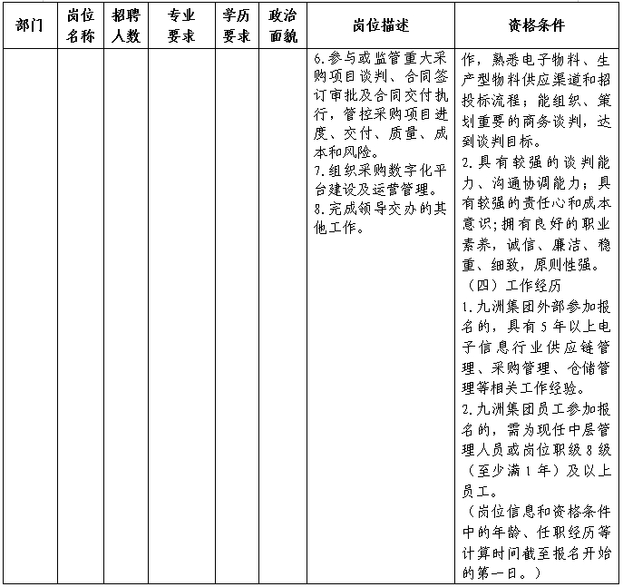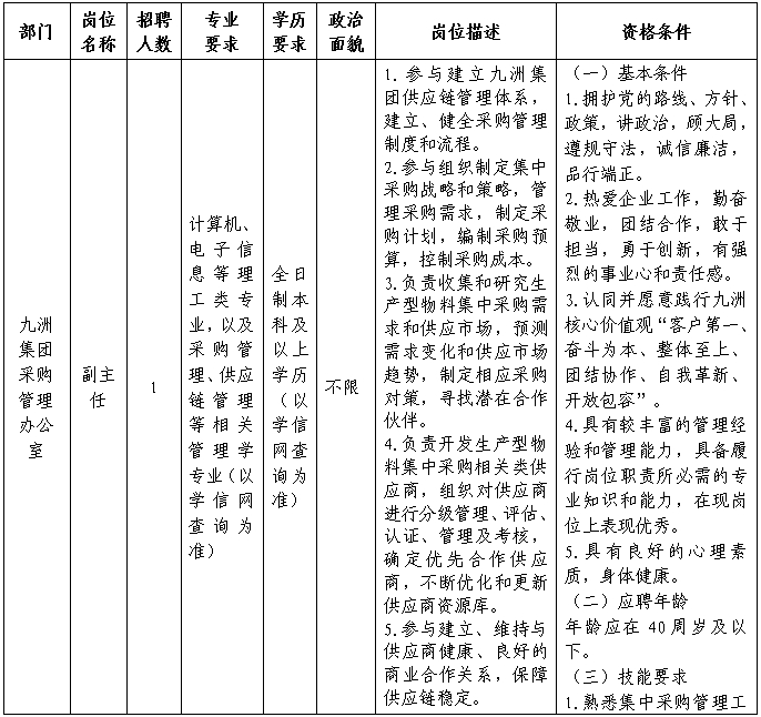 为贯彻落实人才强企战略,强化新一轮改革发展的干部人才支撑,广开视野选拔优秀管理人才加入企业改革发展工作,经研究,四川九洲投资控股集团有限公司(以下简称“九洲集团”)决定面向社会公开选聘中层管理人员。