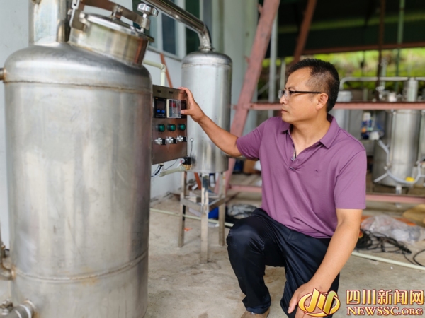 近日,记者来到灵兴镇石堰村三组彭洪明家中,一股酒香扑鼻而来。“酒厂在平武南坝镇,这里只是我们的研发基地。”彭洪明介绍,基地除了研制白酒、果酒酿制工艺外,还研发各类自动化酿酒设备。