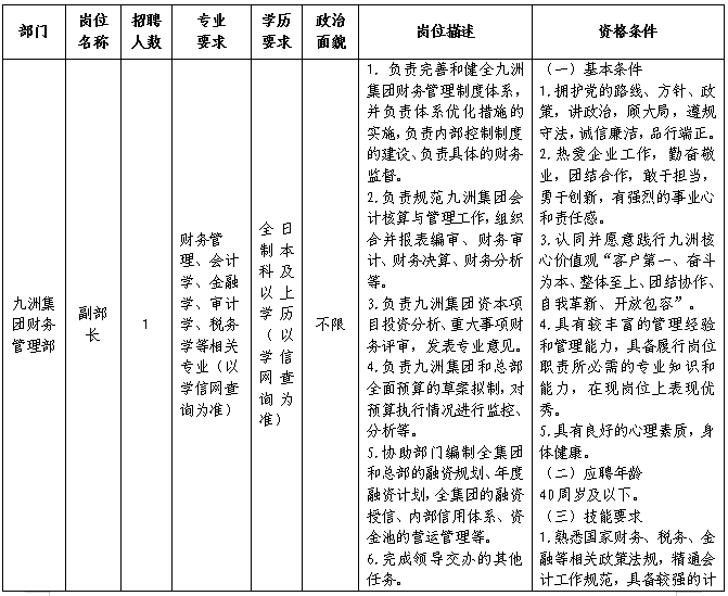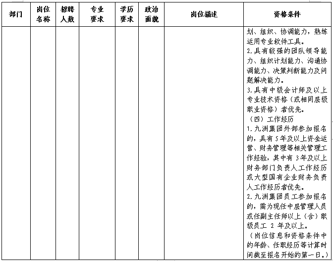 为贯彻落实人才强企战略,强化新一轮改革发展的干部人才支撑,广开视野选拔优秀管理人才加入企业改革发展工作,经研究,四川九洲投资控股集团有限公司(以下简称“九洲集团”)决定面向社会公开选聘中层管理人员。