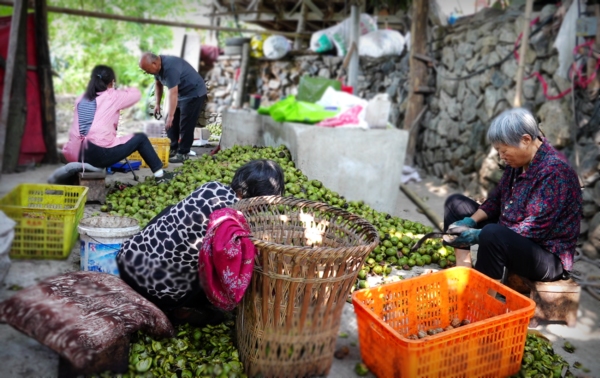 在平武县江油关镇党家沟村,放眼望去,连绵不断的核桃林郁郁葱葱,交错掩映的枝丫上挂满了沉甸甸的核桃。村民曾志明的核桃地里,一颗颗青绿浑圆的核桃挂满枝头,核桃园里不时传出竹竿敲打核桃清脆的声音,地上落满了绿油油的青皮鲜核桃,曾志明忙着分拣、装袋。