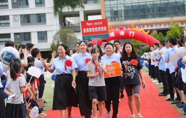 此次开学仪式将小学部和初中部九个年级巧妙地喻作月亮和太阳系八大行星,九个年级的年级主任及学生代表手持年级对应天体气球,依次走过红毯并激情宣言。