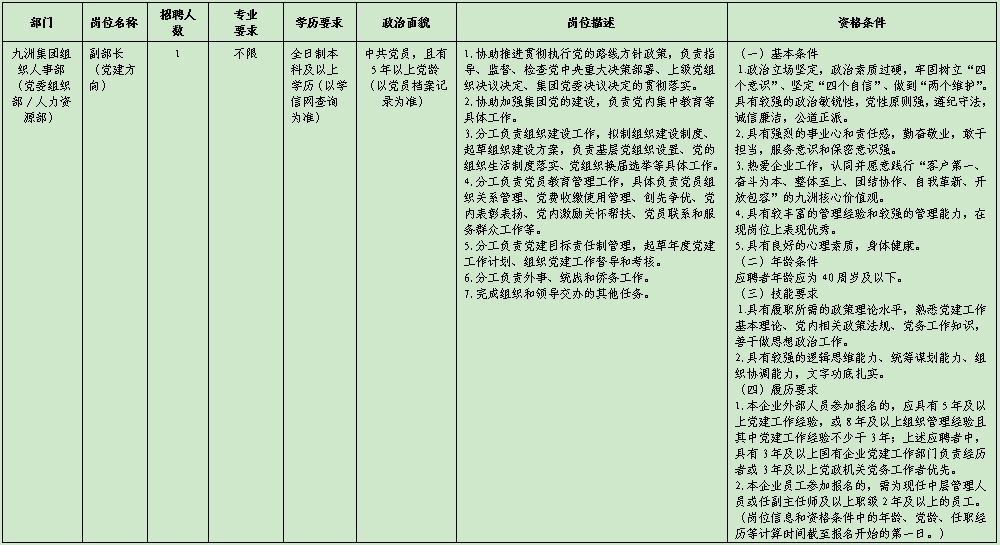 为贯彻落实人才强企战略,强化新一轮改革发展的干部人才支撑,广开视野选拔优秀管理人才加入企业改革发展工作,经研究,四川九洲投资控股集团有限公司(以下简称“九洲集团”)决定面向社会公开选聘中层管理人员。