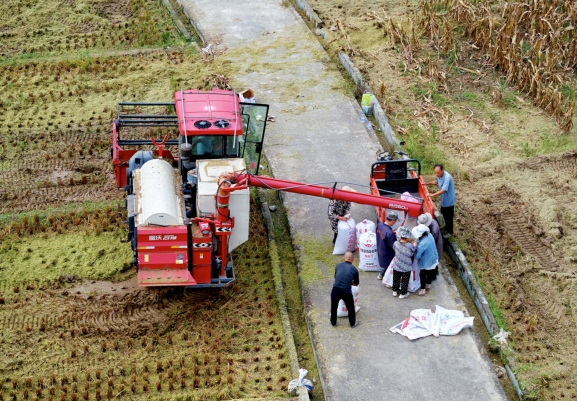 农户们抢抓晴好天气,组织收割机、脱粒机等农机收割水稻,以确保稻谷颗粒归仓。收割机穿梭在稻浪里,机器的轰鸣声和农户的欢笑声此起彼伏,收割、脱粒、碎秆……田间地头一派繁忙的丰收景象。