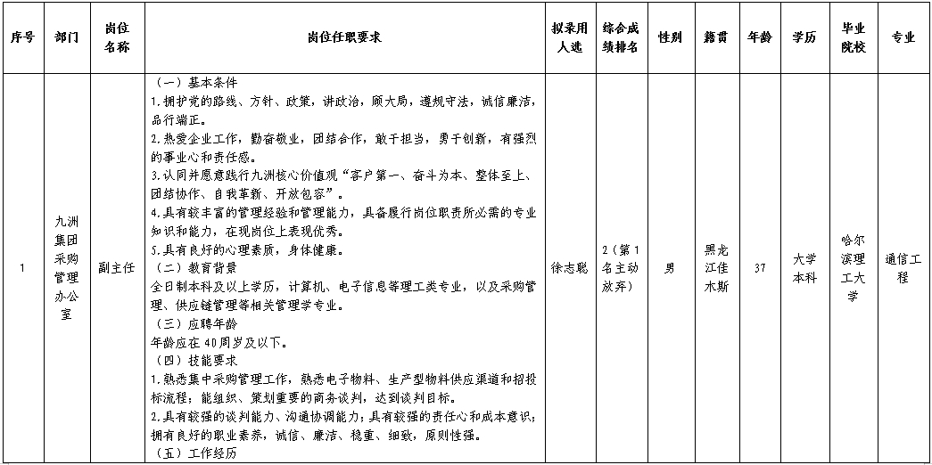 根据四川九洲投资控股集团有限公司发布的招聘公告及招聘相关规定,经笔试、面试、考察等程序,拟录用徐志聪同志到四川九洲投资控股集团有限公司工作,现予以公示,具体情况如下: