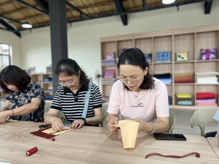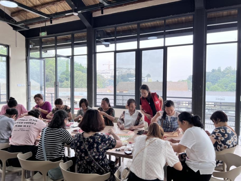 “大家注意,封口的时候要留两指宽的距离哦”,与此同时,在另一旁的拼布工作室,绵阳拼布非遗传承人顾玥瑜正在给参加手工拼布活动的居民们讲授缝补技巧。