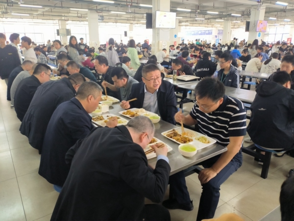 在学校食堂,一边察看各售卖窗口学生购买饭菜情况,一边听取学校负责人汇报食堂管理经营情况。然后在学生10元套餐窗口购买饭菜,陪学生一起就餐,不时询问学生对饭菜的口味、份量的评价和意见。